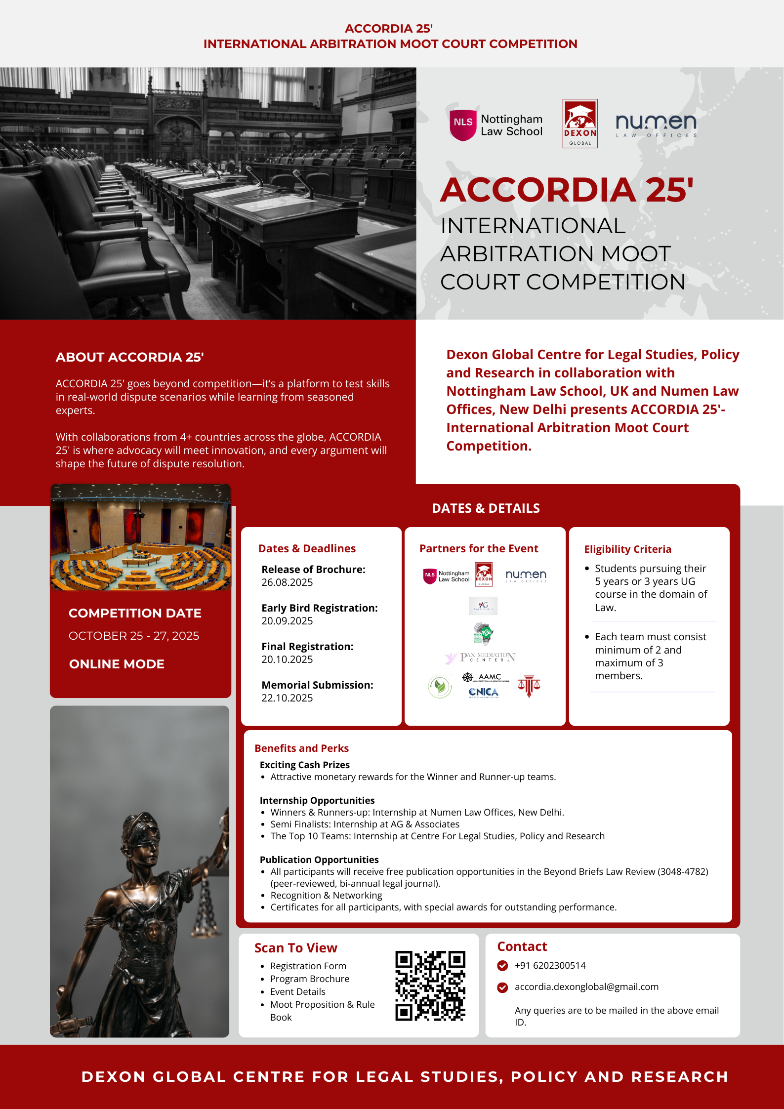 ACCORDIA 25′: International Arbitration Moot Court Competition | Dexon Global Centre for Legal Studies, Policy and Research in collaboration with Nottingham Law School, UK | 25-27 October, 2025